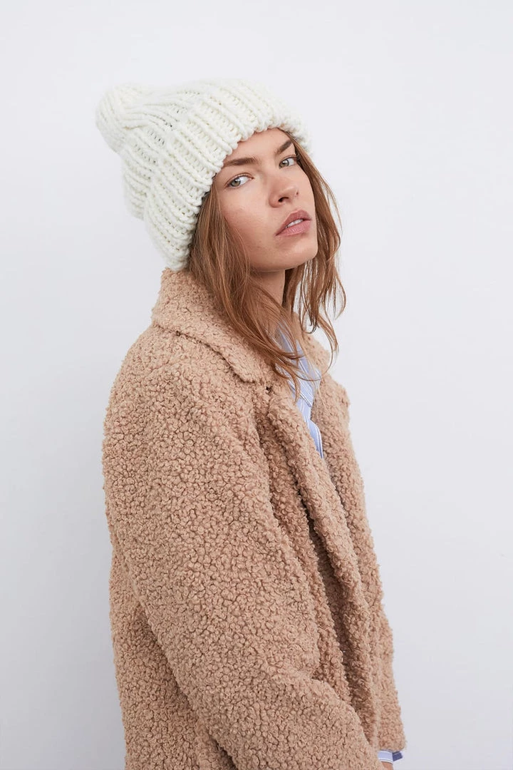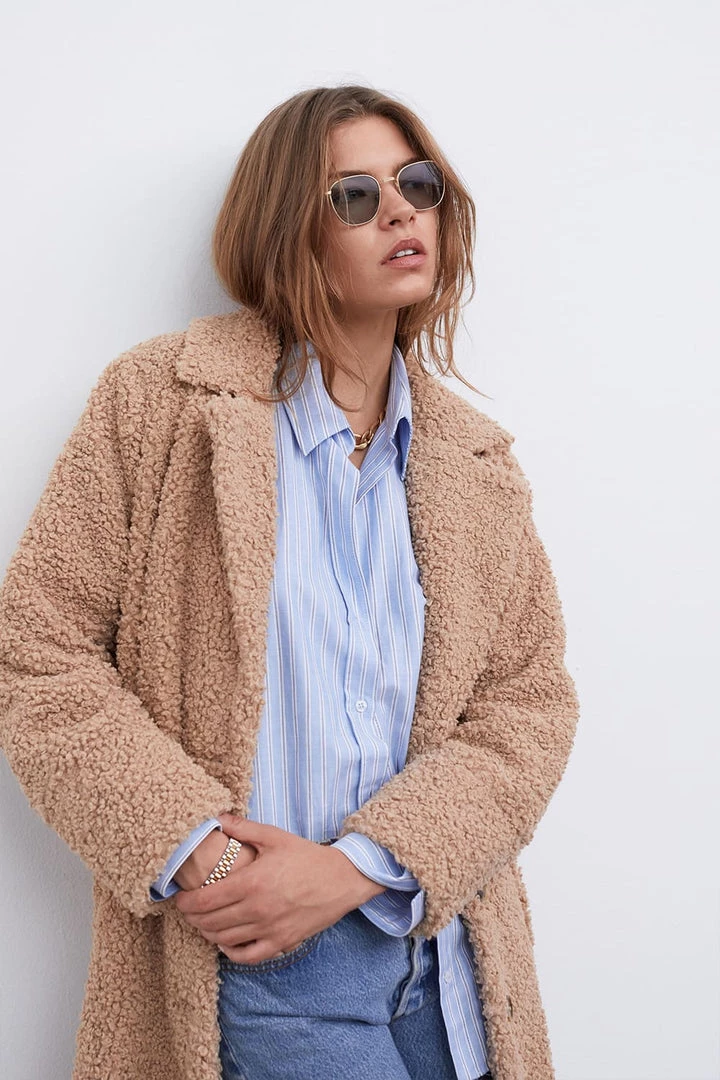 Stay warm and look cool all season in this long coat. Perfectly cozy in faux Sherpa fabric and a neutral shade for a goes-with-every-outfit appeal.