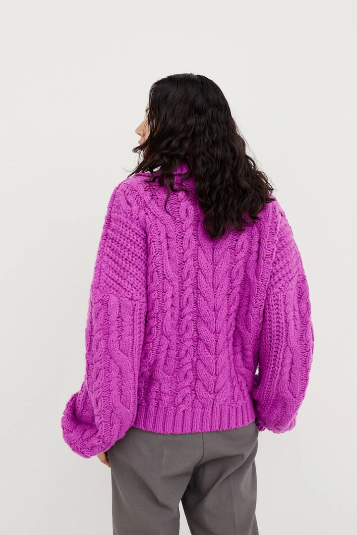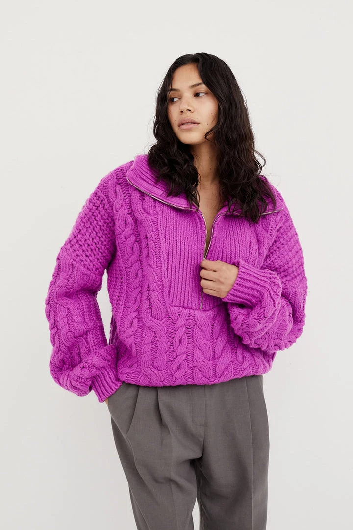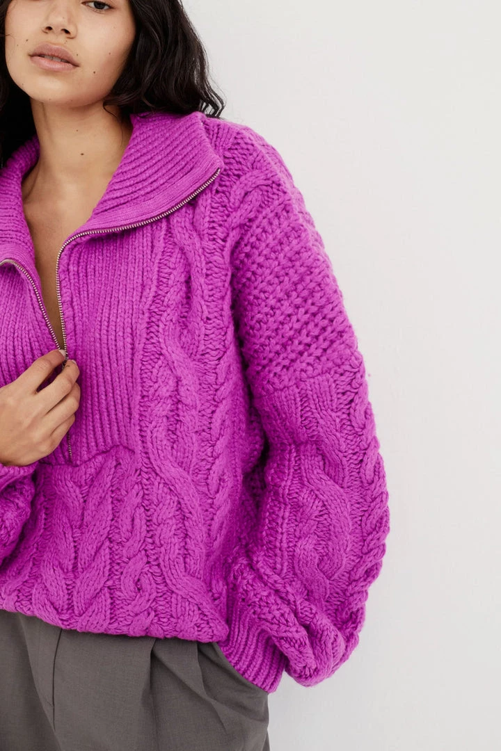 Bold cable knit polo sweater featuring a sporty zip front and oversized fit.