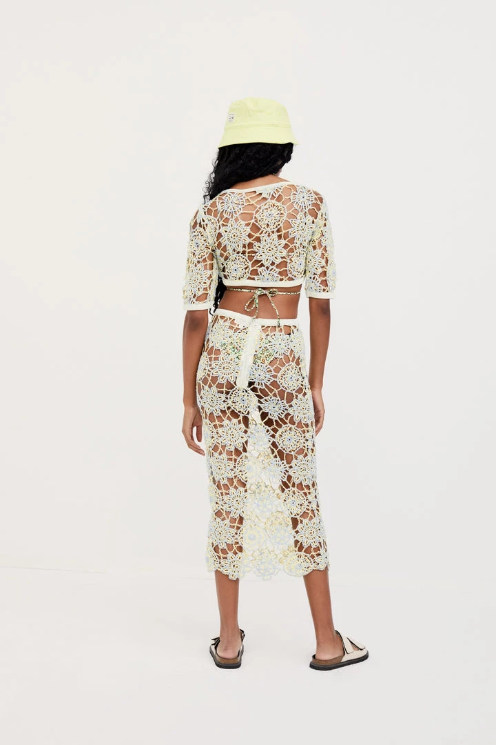 Vintage-inspired open-knit crochet pencil skirt with a side zip closure.
