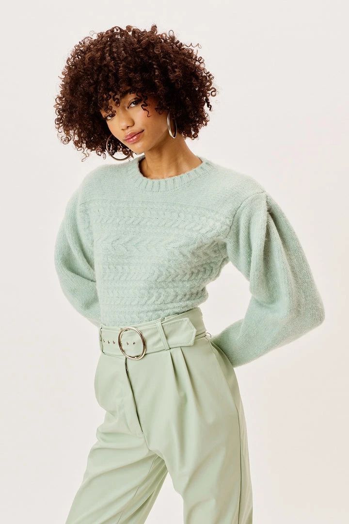 70s-inspired mixed scale cable knit sweater featuring dramatic shoulder pads and a box pleat on sleeves.