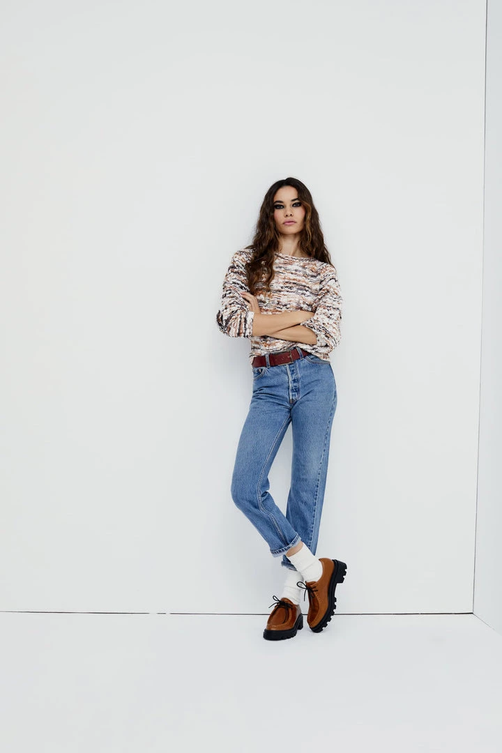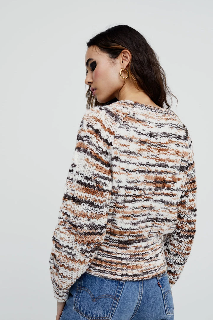 Vintage-inspired cable knit sweater featuring a muted variegated tricolor pattern. Deliciously soft feel, pullover fit.