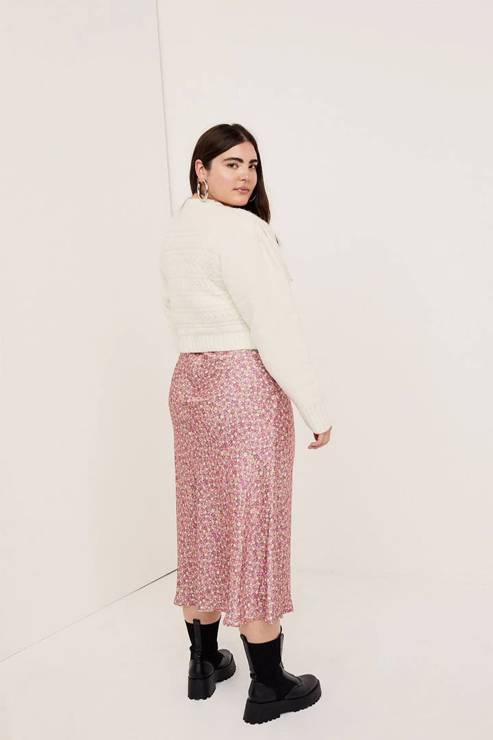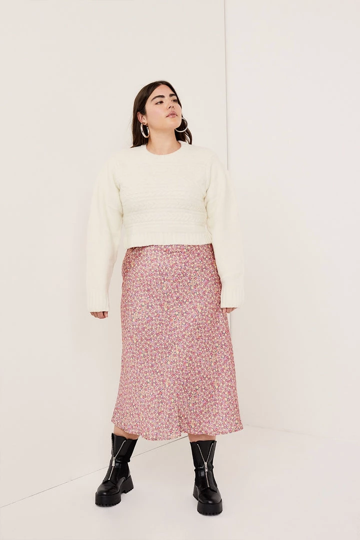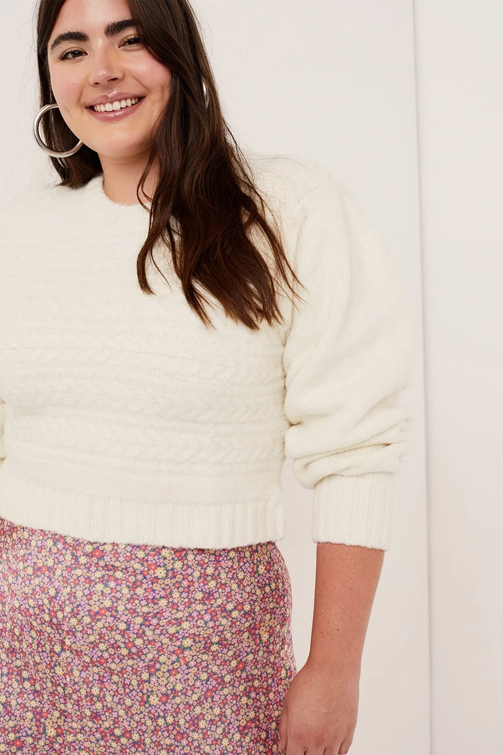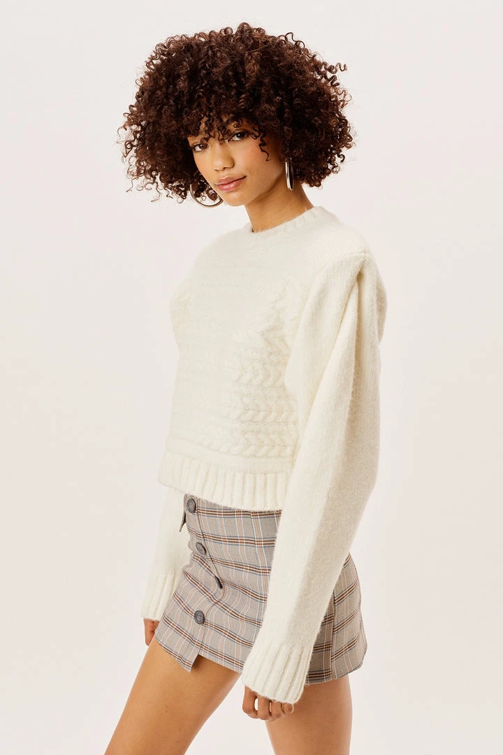 70s-inspired mixed scale cable knit sweater featuring dramatic shoulder pads and a box pleat on sleeves.