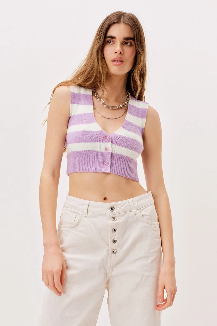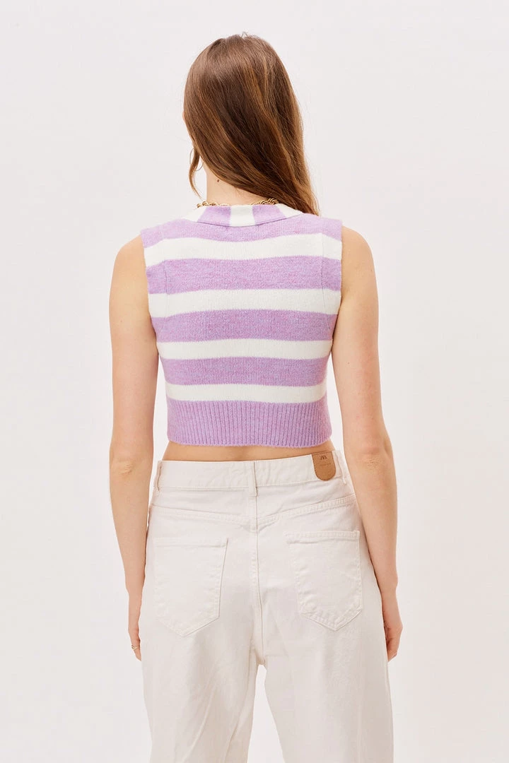 70s-inspired stripe sweater vest featuring a V-neckline and tonal front buttons.