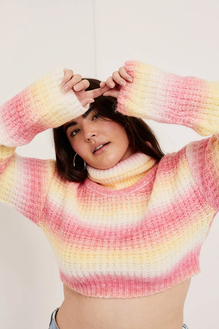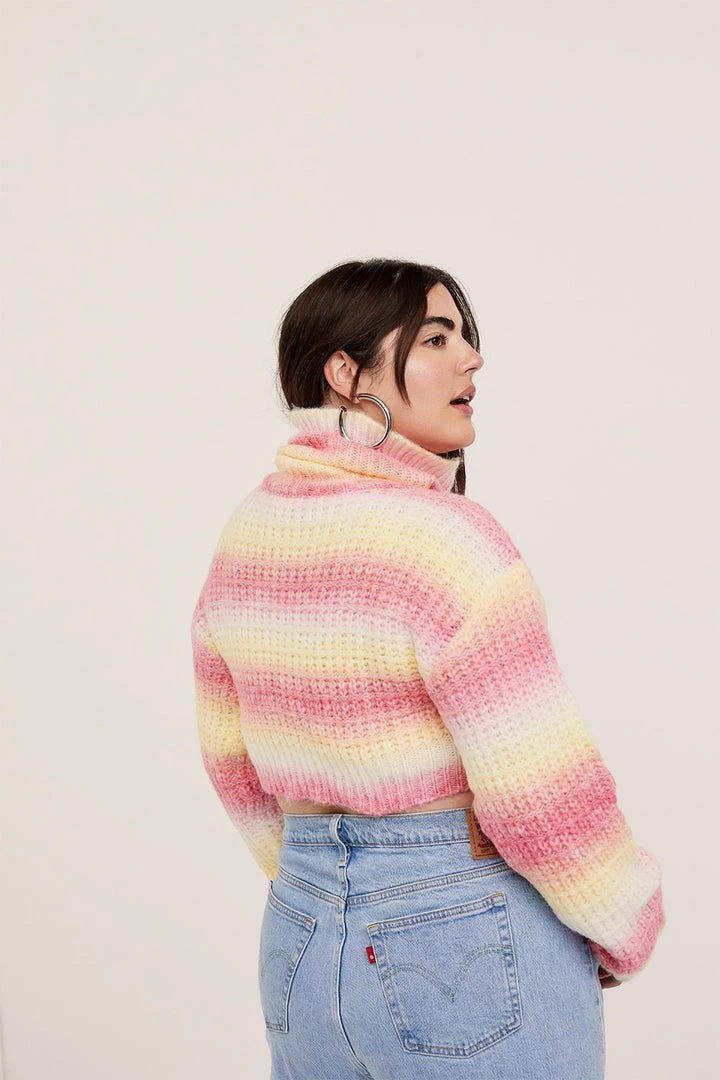 90s-inspired waffle knit ombre stripe cropped tank sweater featuring a dramatic open back. Due to the nature of the ombre detail & knitting process, every piece is unique and will differ slightly from the image on our site.
