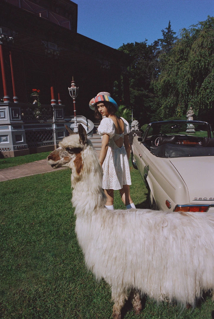 Dreamy linen mini dress featuring eyelet embroidery and a corset that overlays a built-in peekaboo lace bra. Puff sleeves, plunging open back with a hook & eye closure.