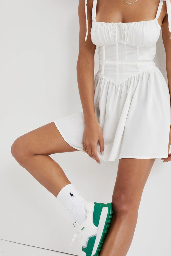 Breezy poplin mini dress featuring a feminine shirred drawstring bust and corset detailing at waist. Delicate ties at shoulders with a hidden back zipper. Made from eco-responsible Ecovero poplin.