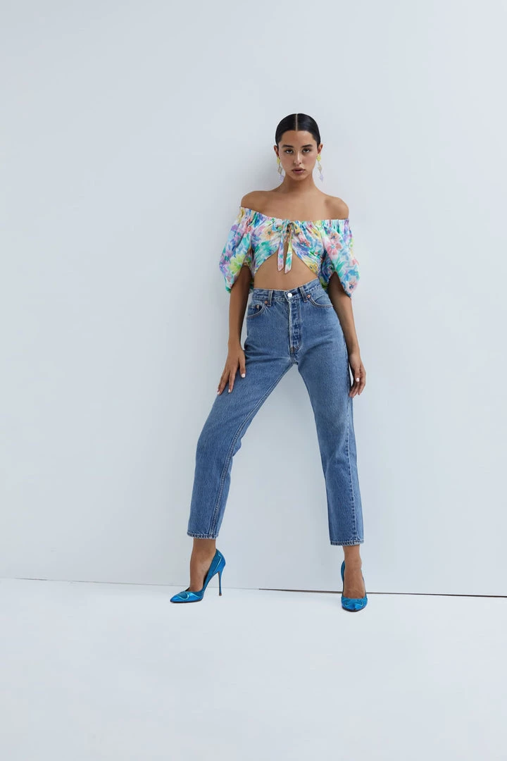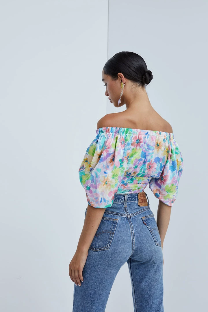Vibrant floral stretch satin crop top featuring a gathered neckline and bubble sleeves. Delicate tie and button closure at front, ruched waistband. Fully lined.