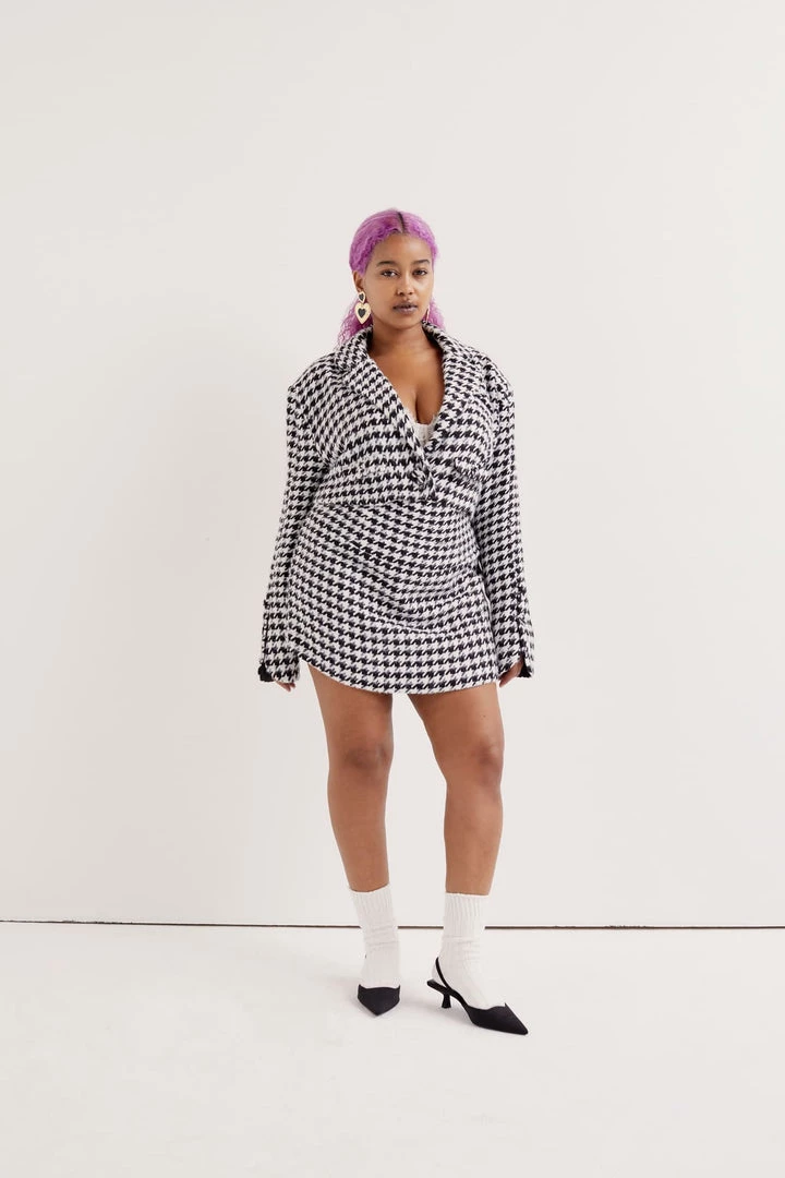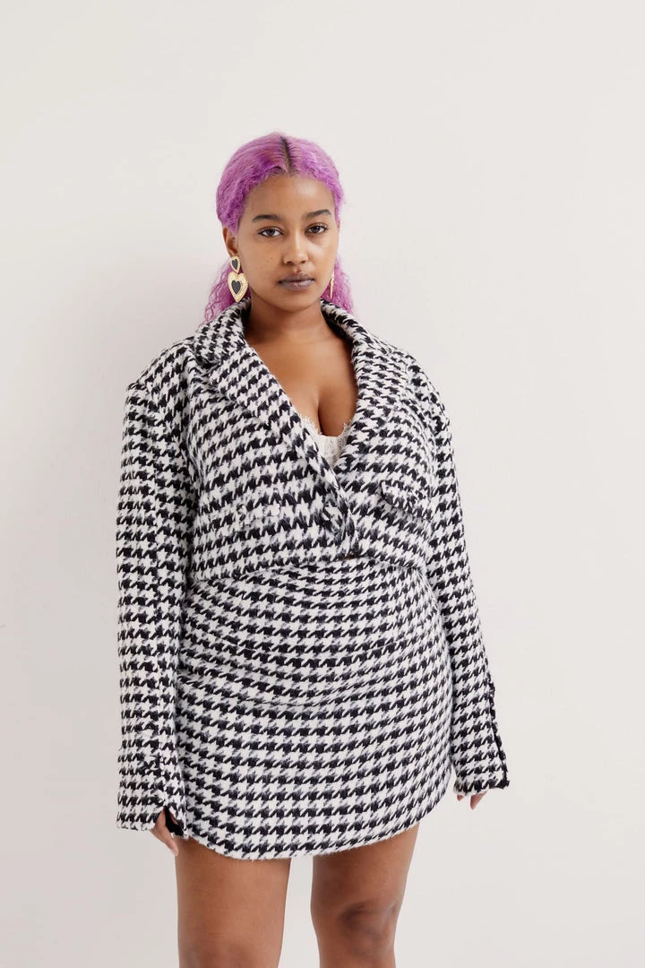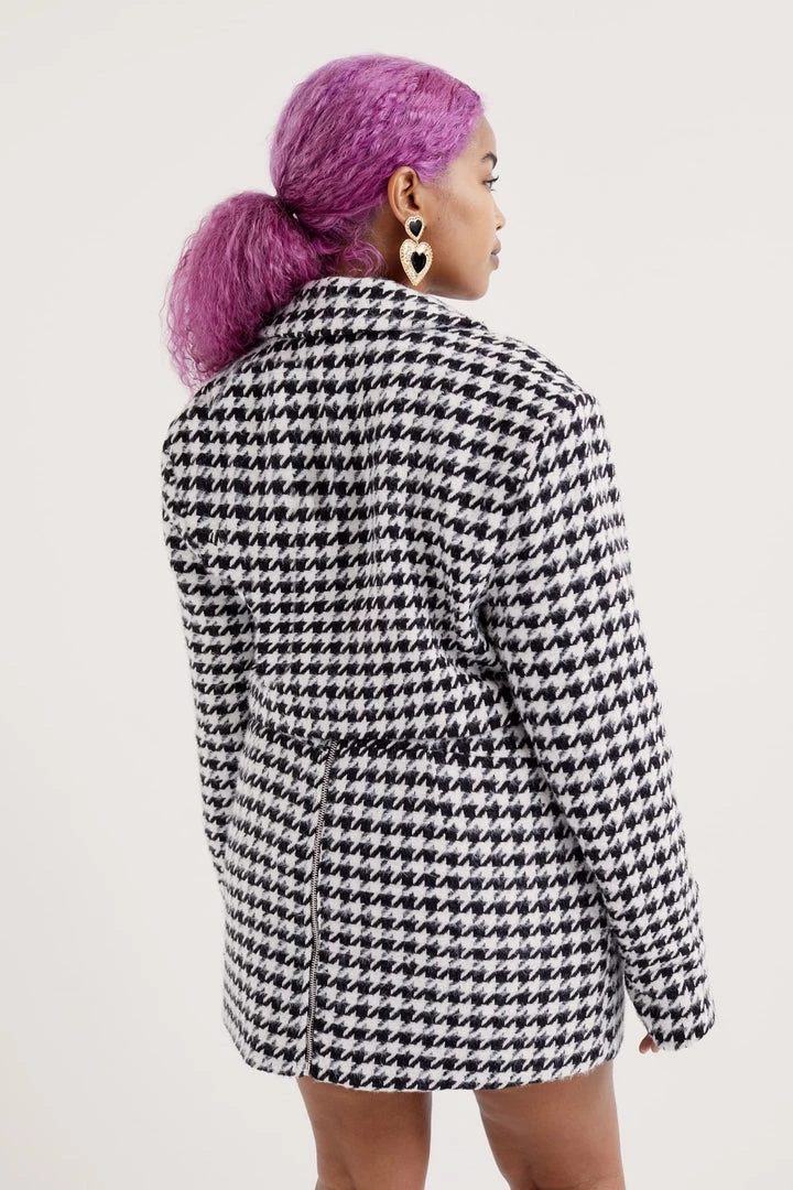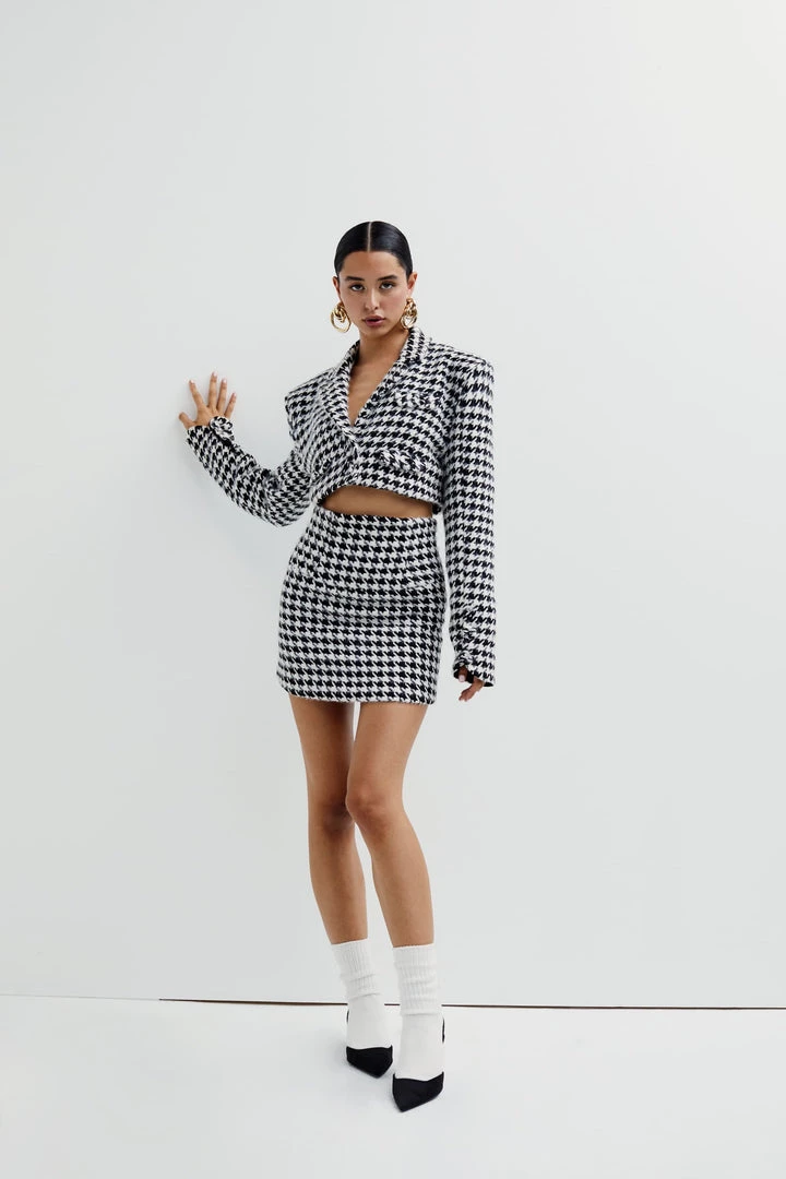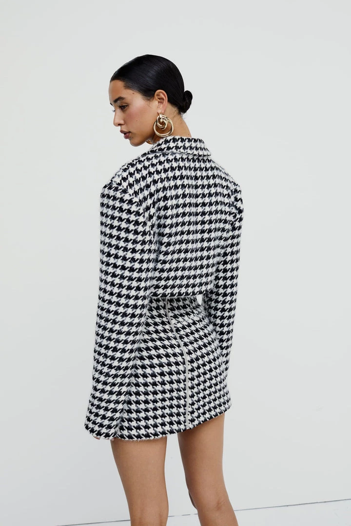 90s-inspired houndstooth mini skirt featuring wide-angled waistband and a deliciously soft feel. Back zipper, fully lined.