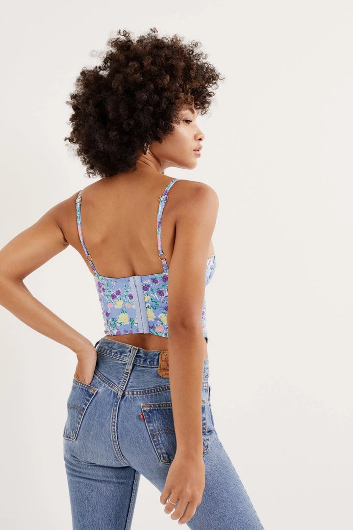Painterly floral bustier top featuring structured cups and a scalloped hemline. Delicate, adjustable shoulder straps, hook & eye closure at back. Made from LENZINGâ„¢ ECOVEROâ„¢fibers.