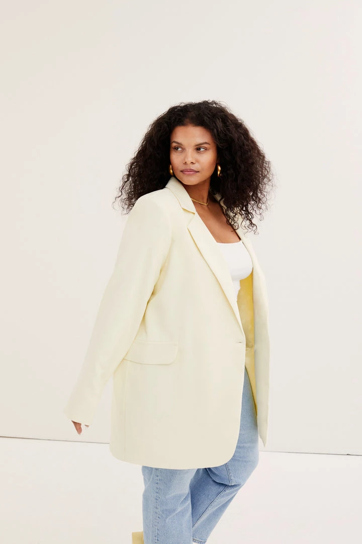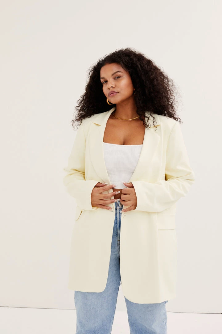 Structured gabardine boyfriend blazer featuring faux pockets and a button closure.