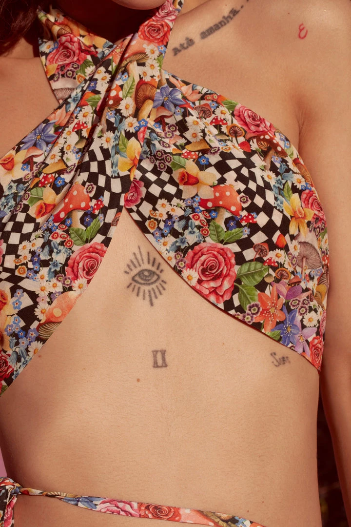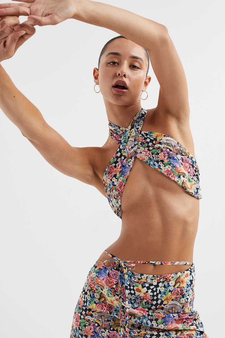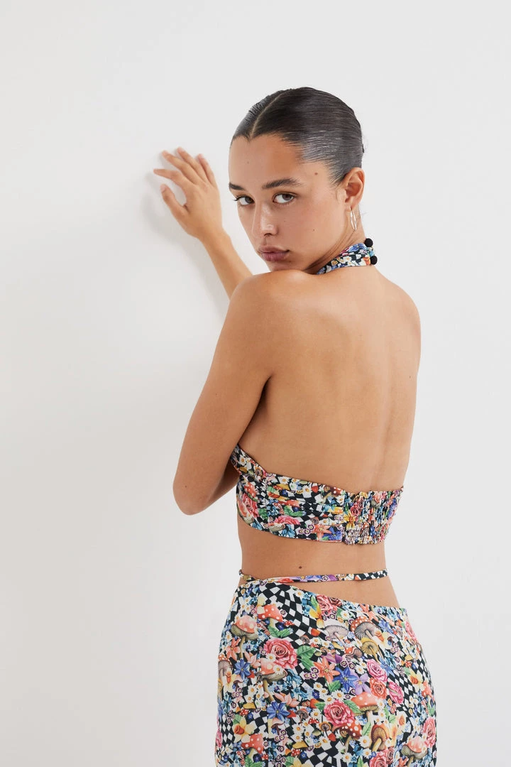 Designed using the iconic Liberty Londonâ„¢ Wonderland print, this cross-front halter top features ruchings across bust and a delicate button closure at the nape of the neck.