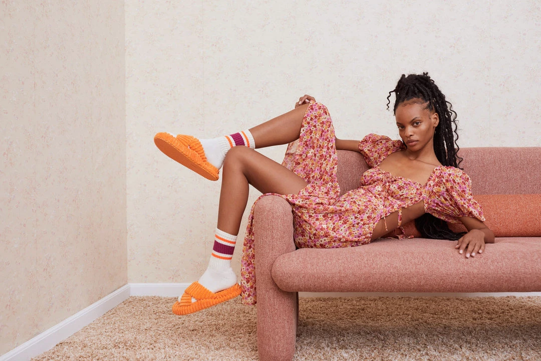 Breezy eco chiffon midi dress featuring a ditsy floral print and a shirred drawstring bust. Puff sleeves, open strappy back with delicate ties.