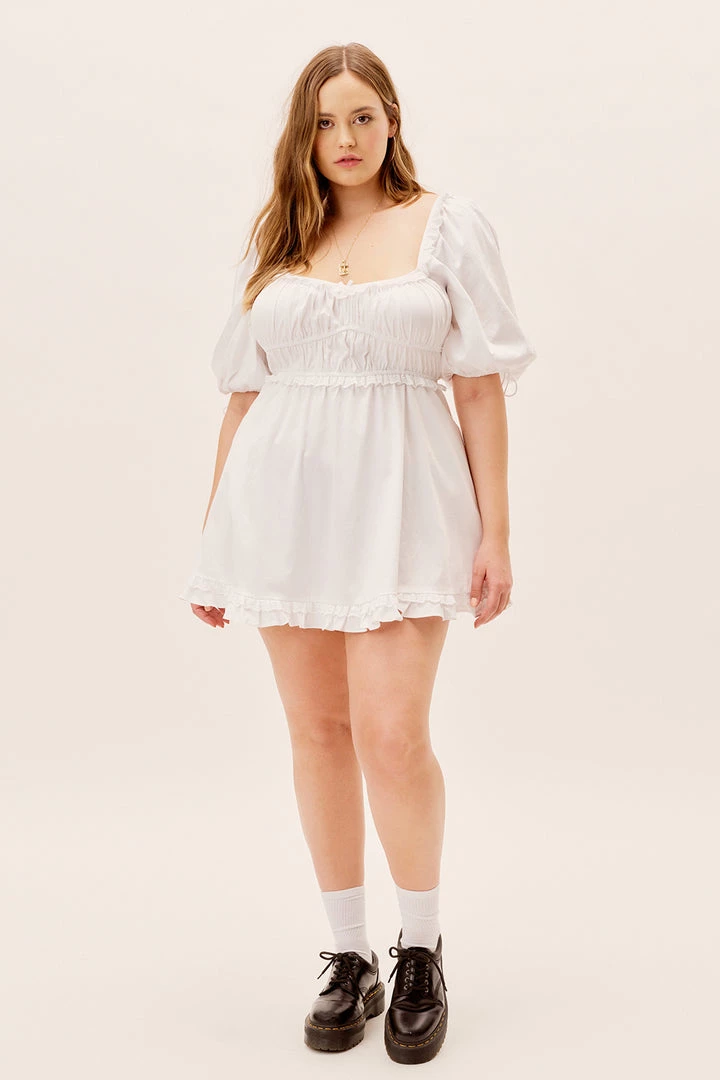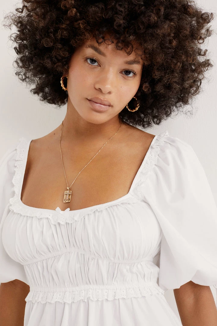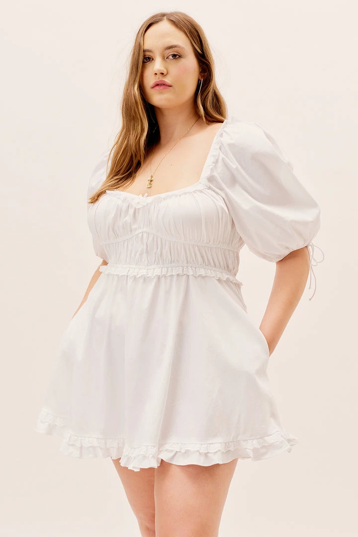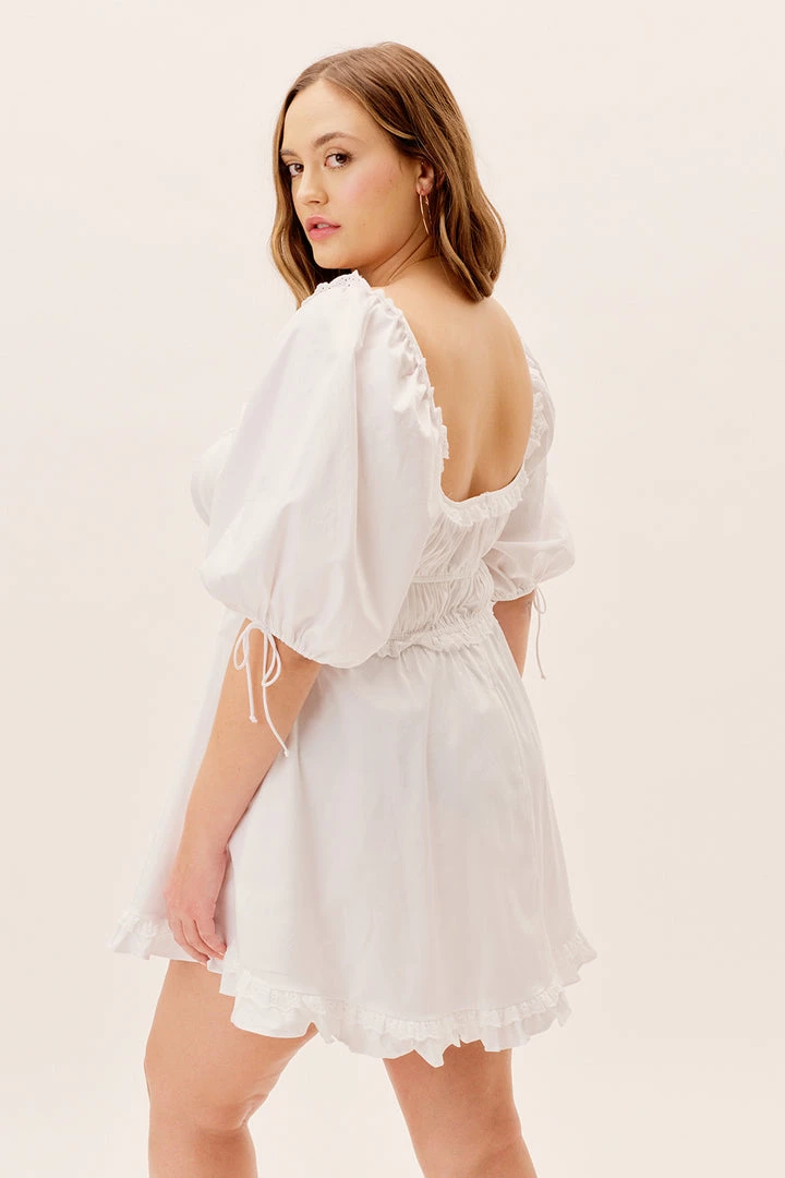 Vintage-inspired cotton poplin mini dress featuring delicate ruffled eyelet trim throughout. Shirred bodice, puff sleeves and side seam hidden pockets. Fit-and-flare silhouette.