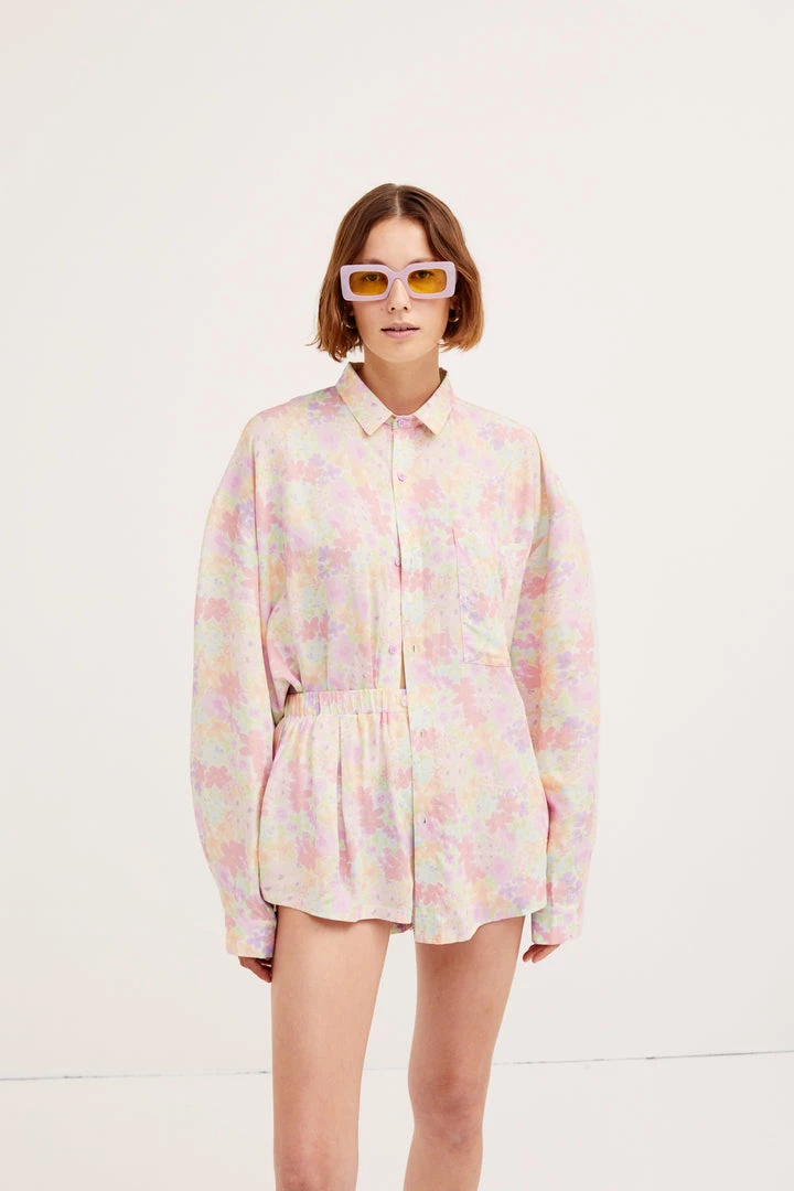 Pastel floral oversized poplin button-up shirt with chest pocket and crosshatch stitched patch detail.