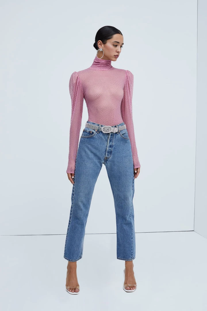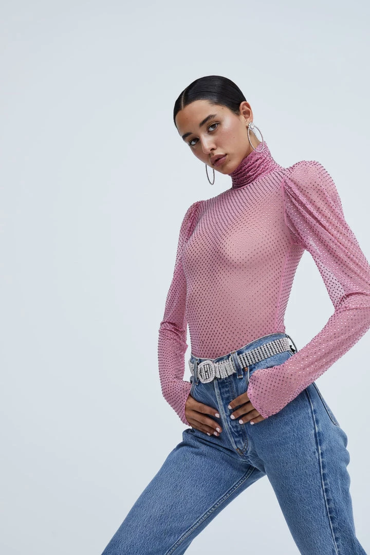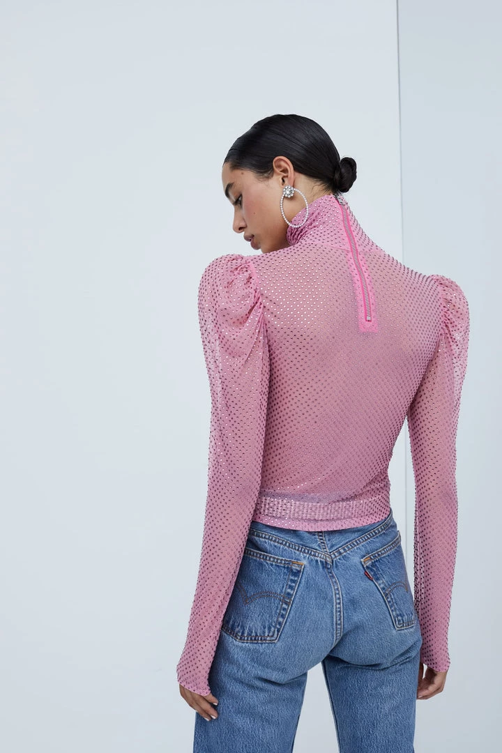 Racy sheer crystal mesh top featuring gathered sleeves and a mock neck. Zipper at back, unlined.