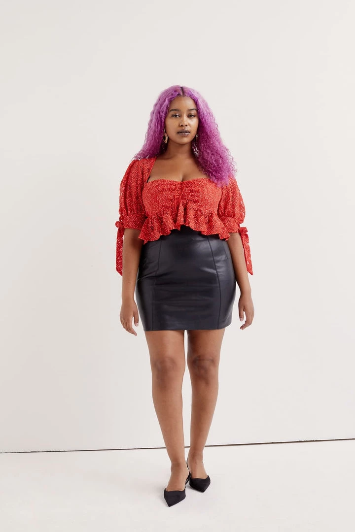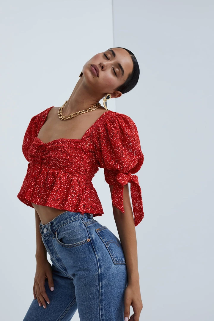 Delicately dotted lace crop top featuring a gathered neckline, voluminous puff sleeves, dainty ties. Pull-on fit, bust is lined.