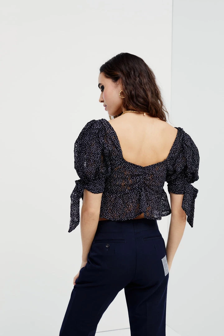 Delicately dotted lace crop top featuring a gathered neckline, voluminous puff sleeves, dainty ties. Pull-on fit, bust is lined.