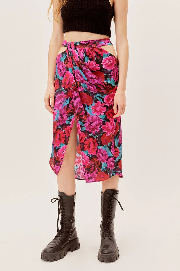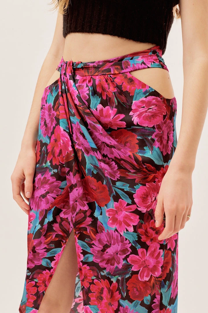 Bold floral brushstroke faux wrap midi skirt featuring twist detailing at waist and edgy hip cutouts. Invisible zipper at back.