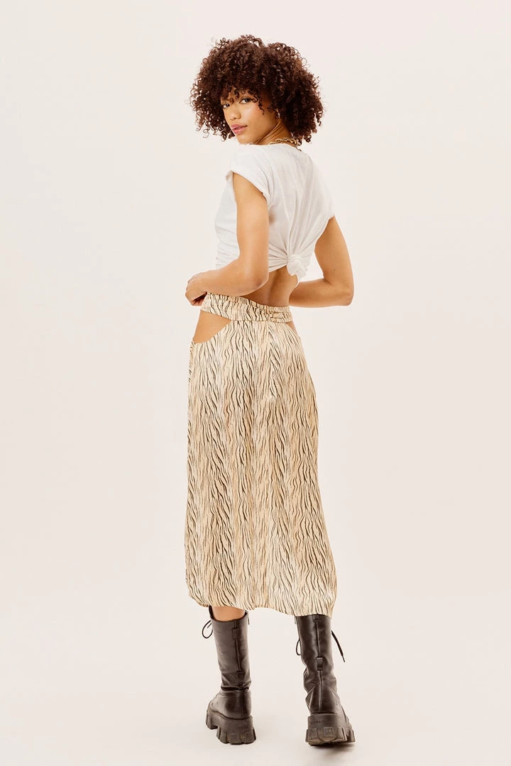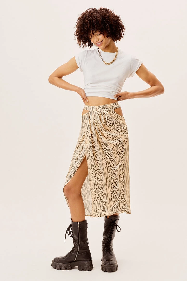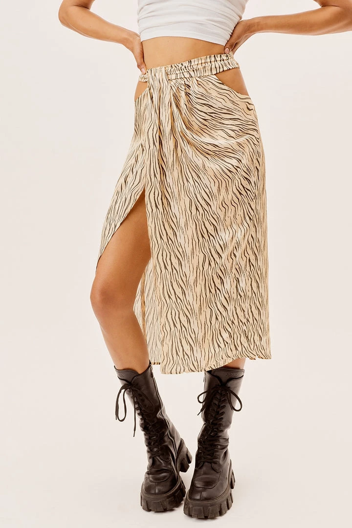 Chic faux wrap satin midi skirt featuring a subtle tiger print, twist detailing at waist and edgy hip cutouts. Invisible zipper at back.