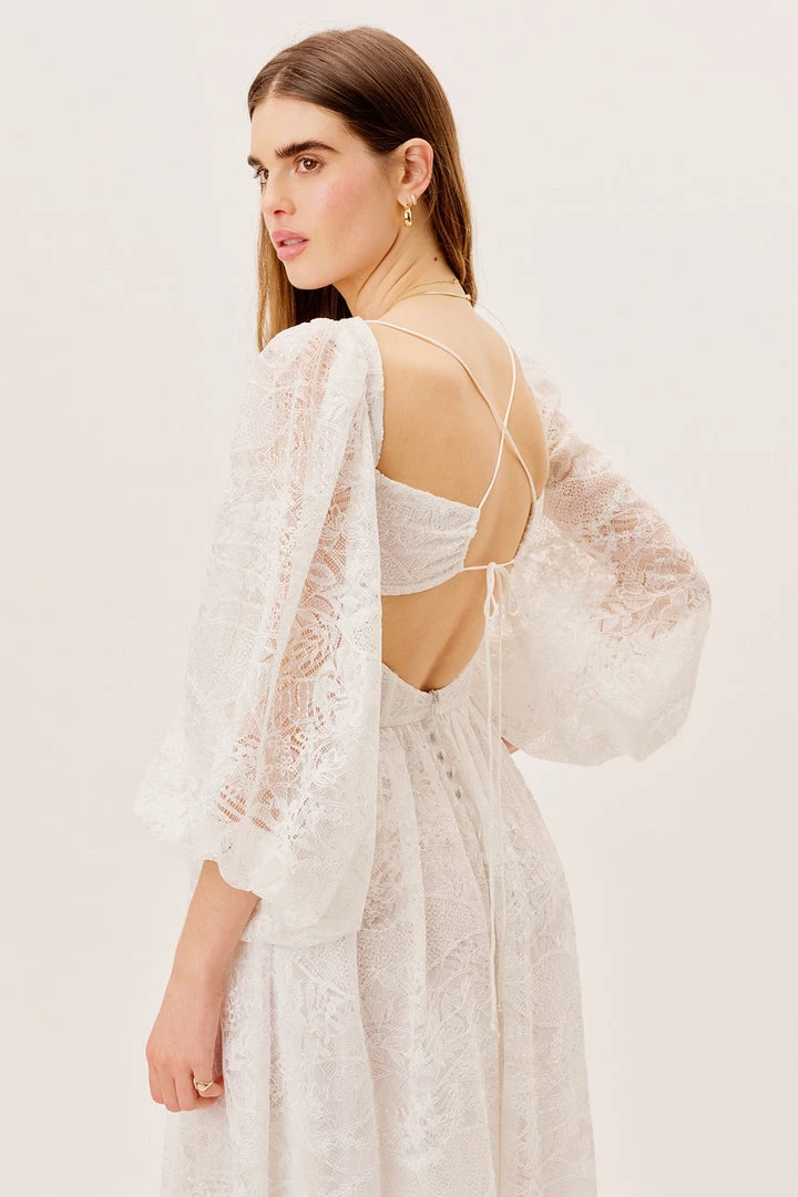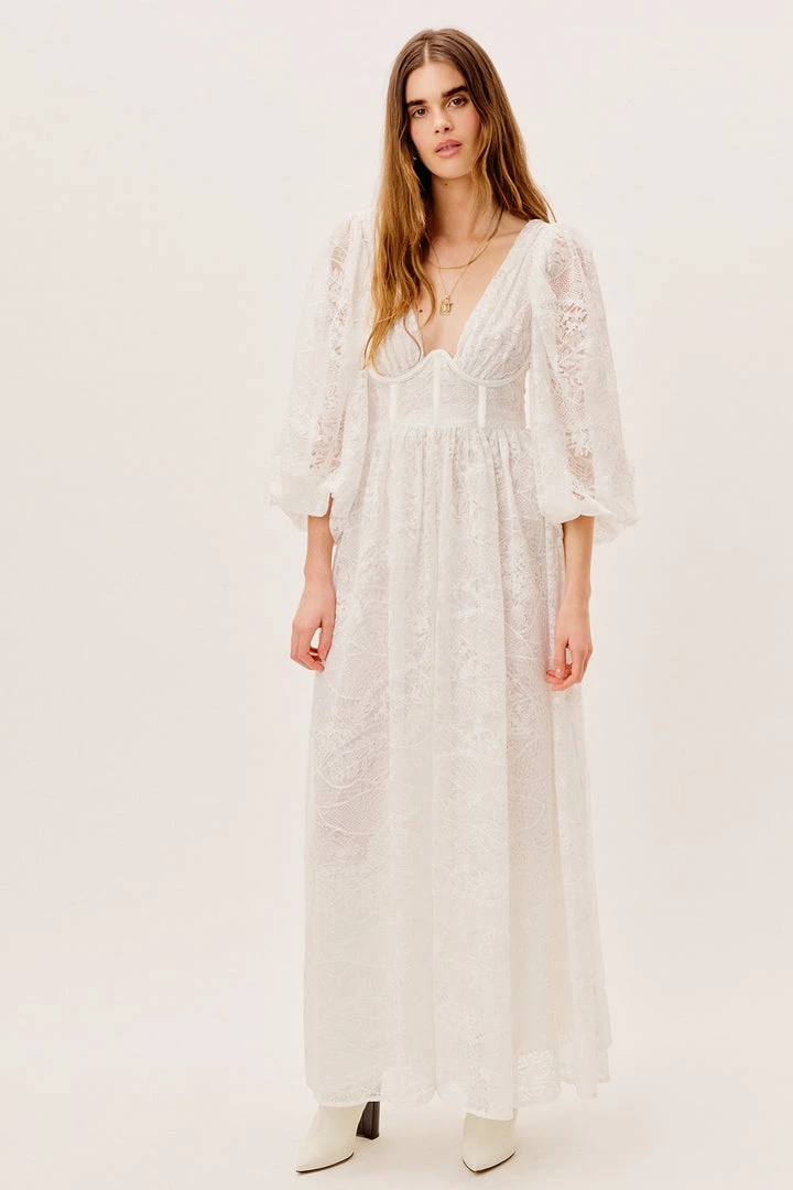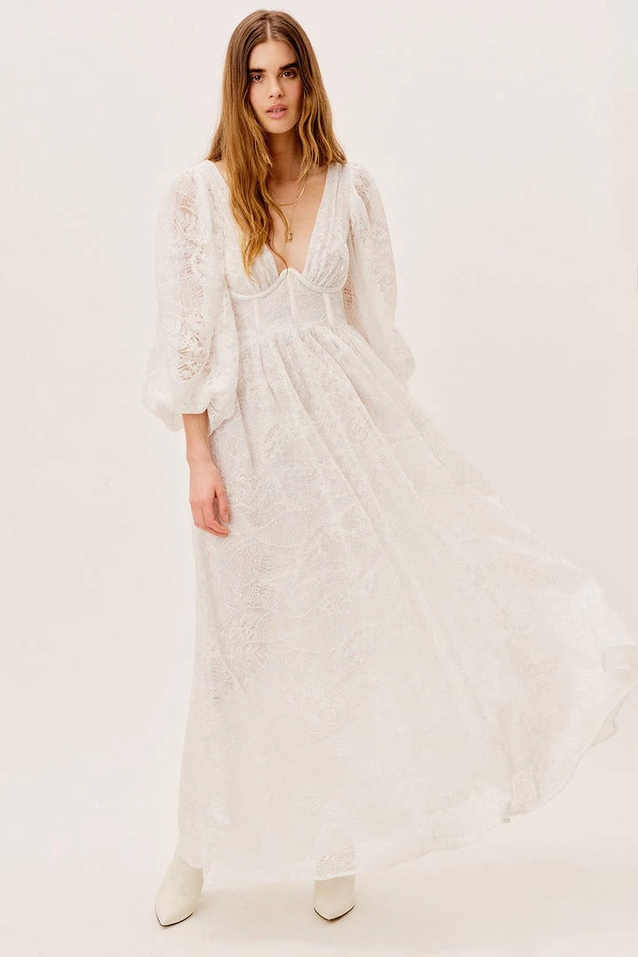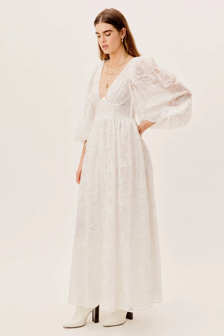 Ethereal wisteria lace maxi dress featuring a plunging neckline, shirred bodice, and a W-shaped underwire. Dramatic billowy sleeves, flowy skirt. Delicate drawstring at back with an invisible zipper.