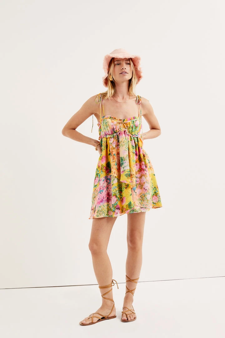 Breezy eco chiffon mini dress featuring a patchwork floral print and gathered detailing at bust. Delicate shoulder ties finish sheer puff sleeves.