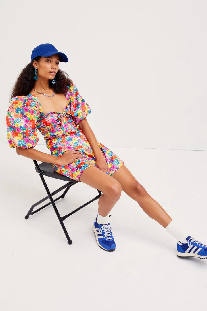 Vibrant floral mini dress featuring short puff sleeves and a ruffle- trimmed neckline and waist.