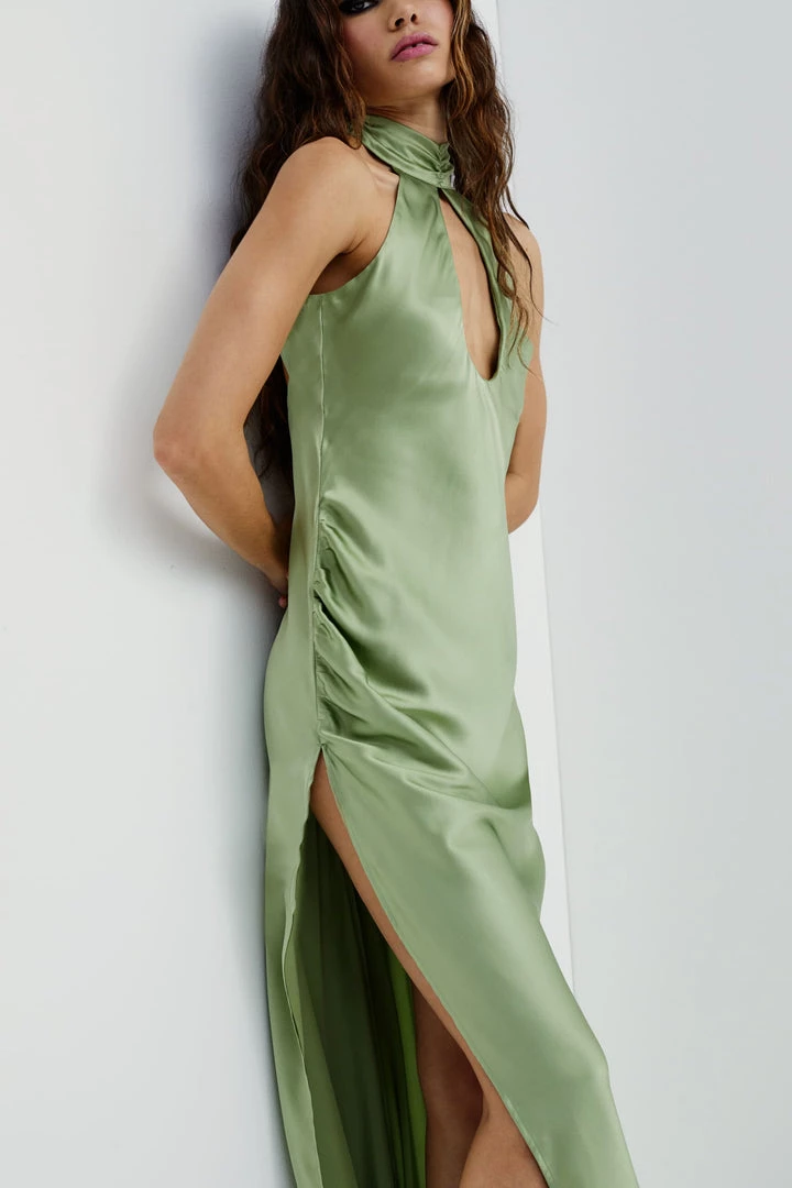 Slinky silky satin column dress featuring a high neck, sexy open back and gathered high slit. Keyhole at neckline, tonal buttons at back. Invisible zipper, partially lined.