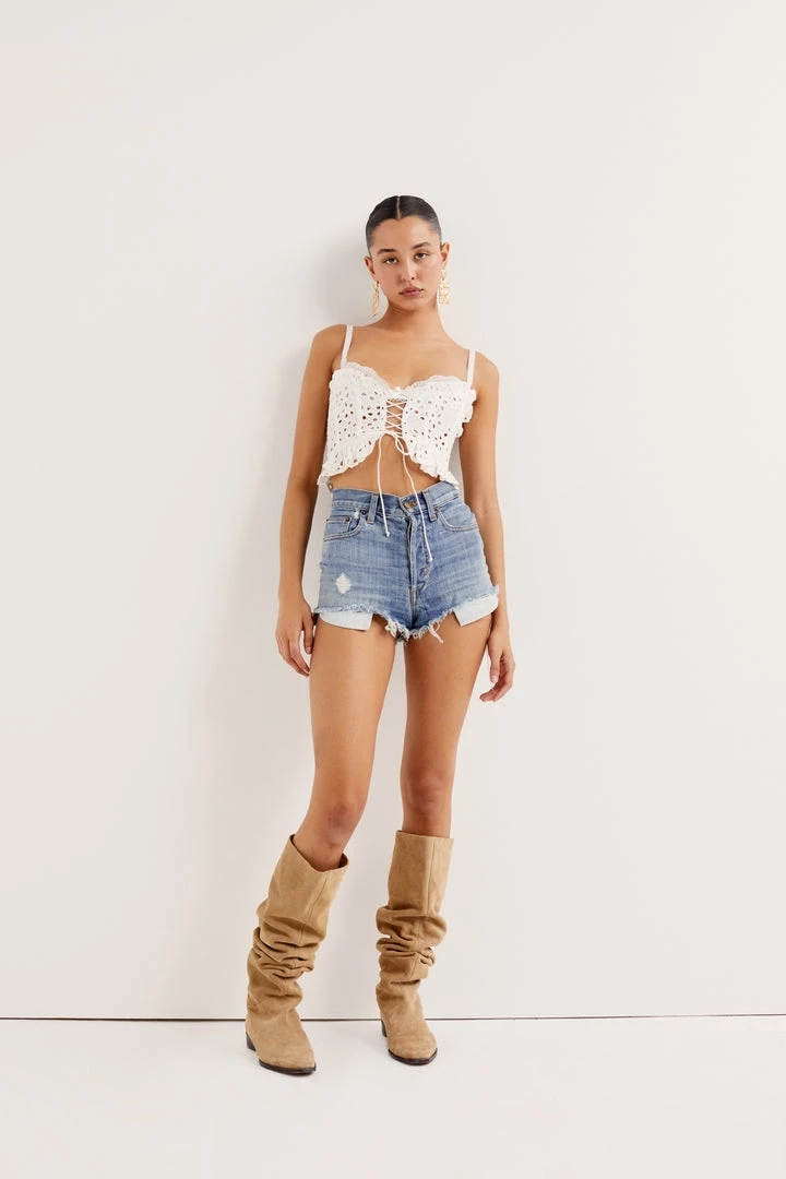Dreamy linen corset crop top featuring eyelet embroidered cut-out details and includes a built-in peekaboo lace bra. Delicate adjustable straps, plunging open back with a hook & eye closure.
