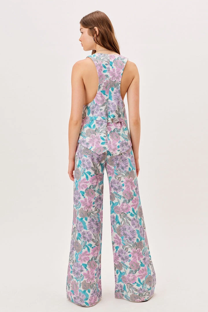 Work of art. Watercolor floral denim wide leg pant featuring rounded front pockets and back patch pockets, belt loops at waist, and hidden metal button.