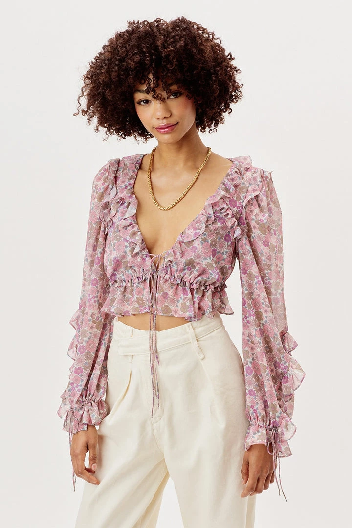 70s-inspired woodstock floral print chiffon top featuring a plunging neckline, cascading ruffle detailing throughout, and adjustable delicate ties. Pretty keyhole back, lined at bust.