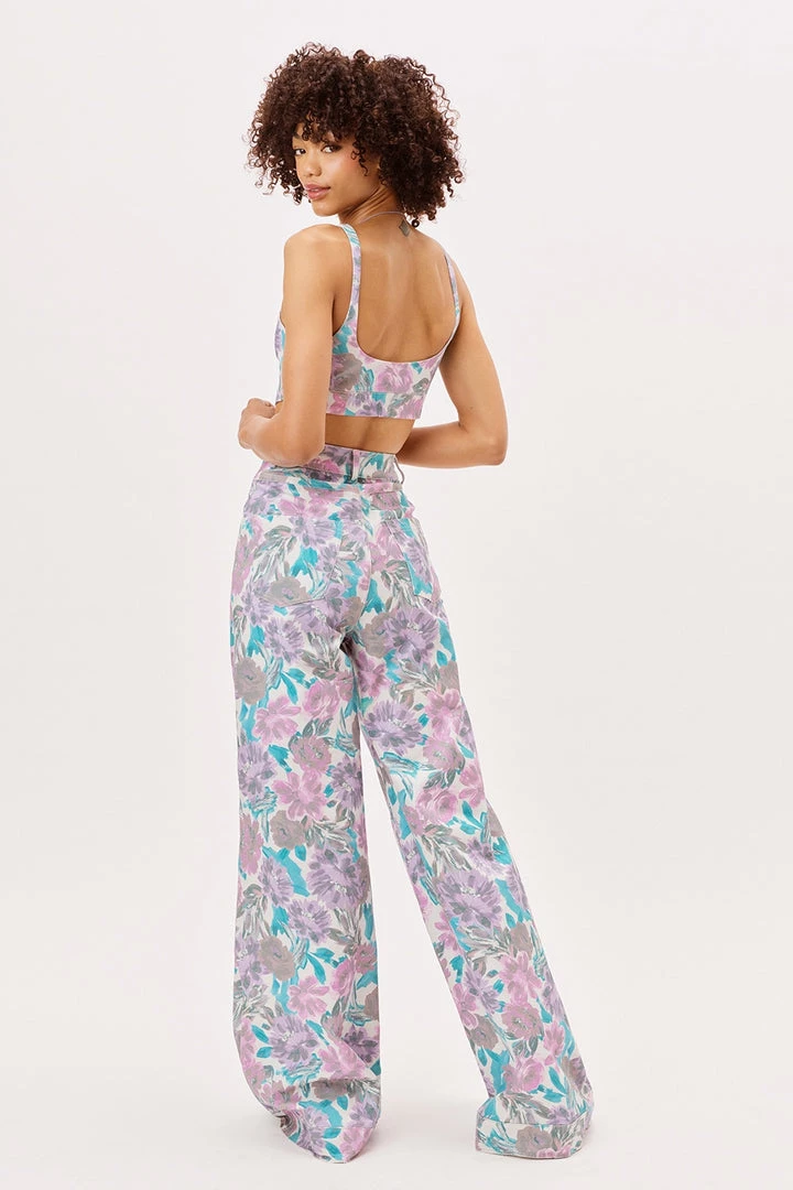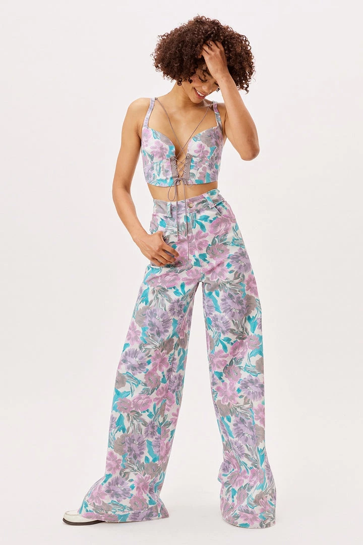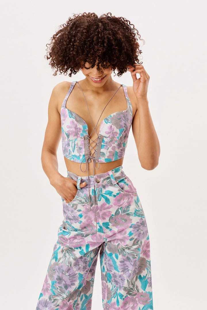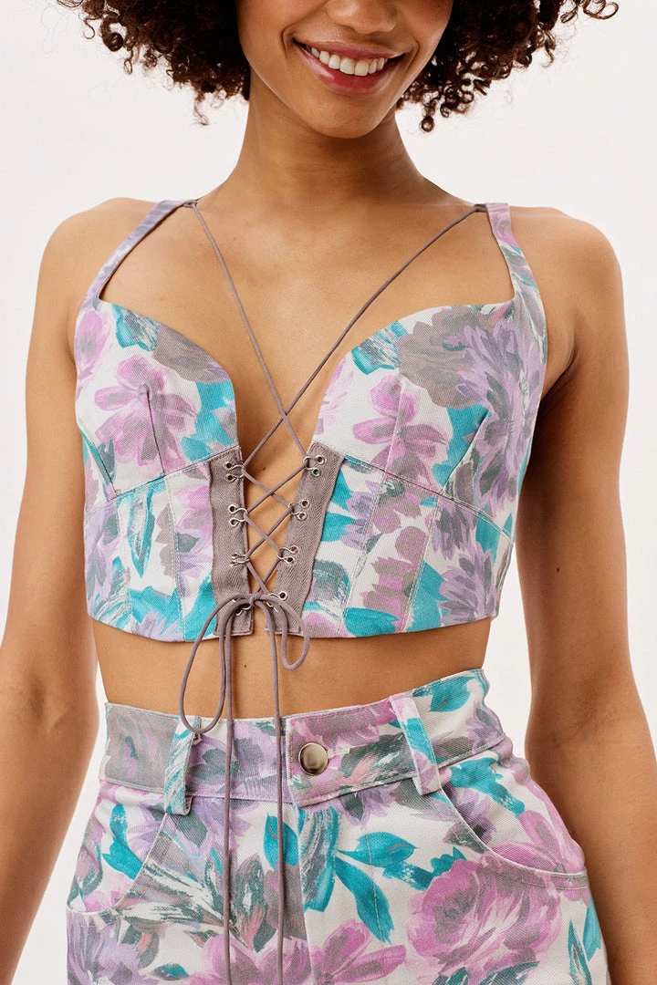 Work of art. Watercolor floral denim corset top featuring a sultry exposed lace-up front with delicate ties along neckline.