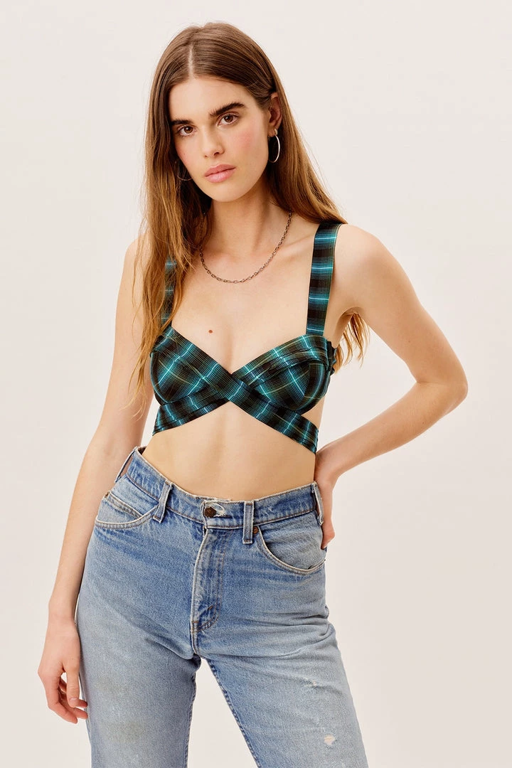 Fresh plaid poplin underwire bra top featuring a playful wrap around waist tie, adjustable shoulder straps, and drawstring tie closure at back.
