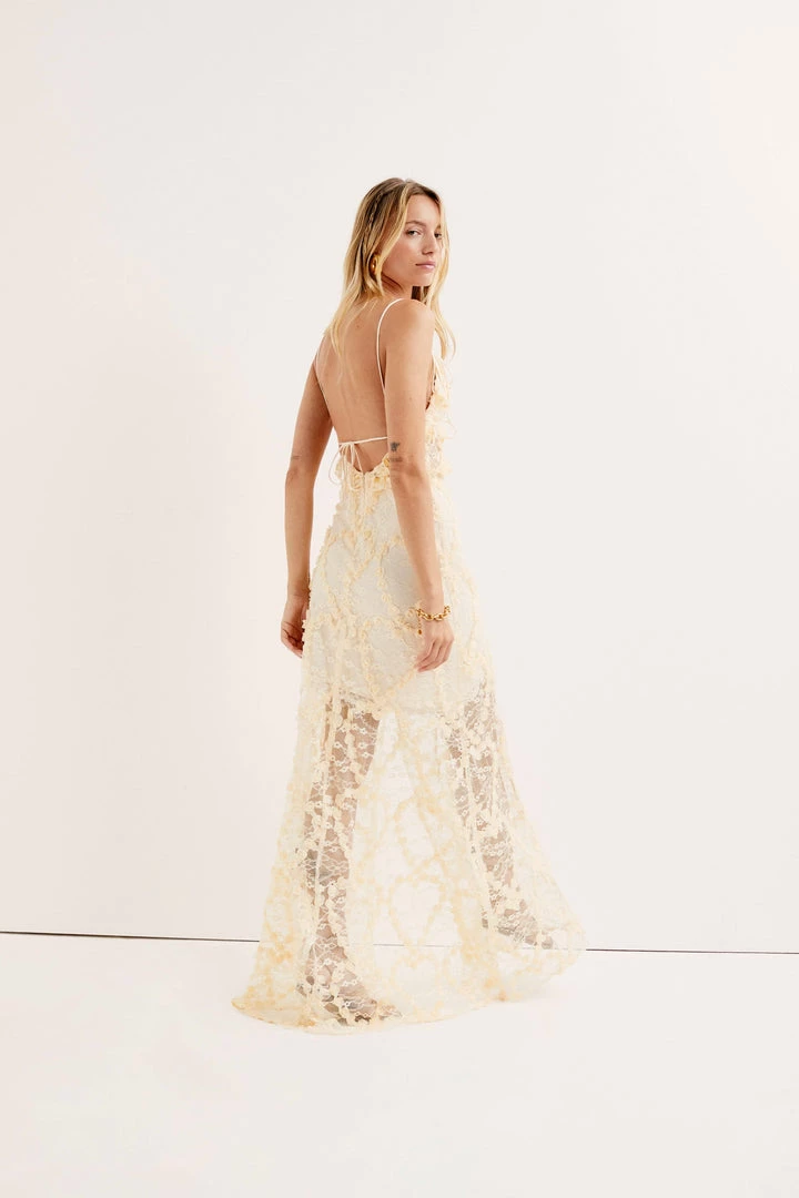 Dreamy lace mini dress featuring delicate rosette hearts and satin jacquard ruffles throughout. Low open back with a delicate tie closure.