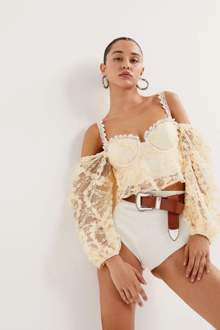 Rosette heart lace blouse with underwire cups and heart trimmed neckline. Floral jacquard elastic encased shoulder straps and lining.
