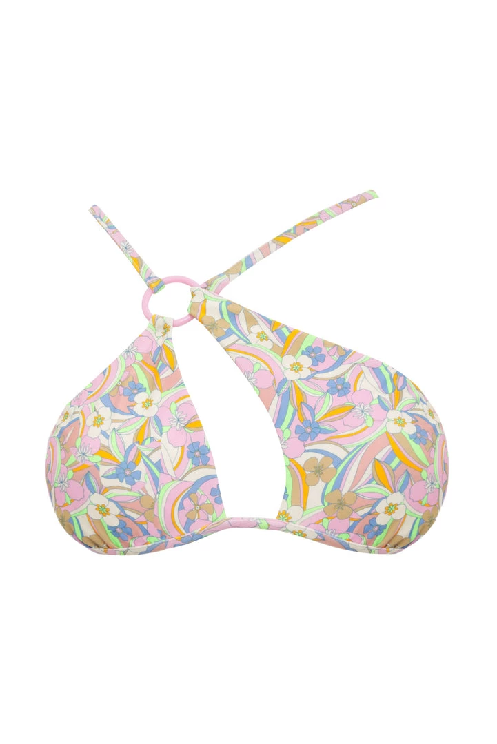 70s-inspired bikini top featuring an asymmetrical one shoulder design and pastel pink ring hardware. Delicate shoulder straps with a tie at back.