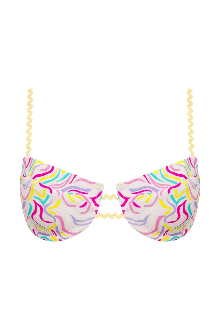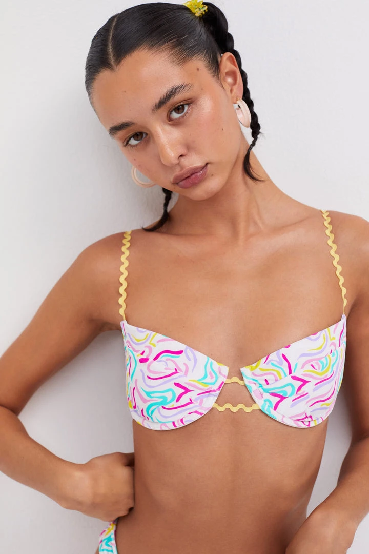 80s-inspired underwire bikini top featuring rickrac detailing at bust and adjustable shoulder straps.