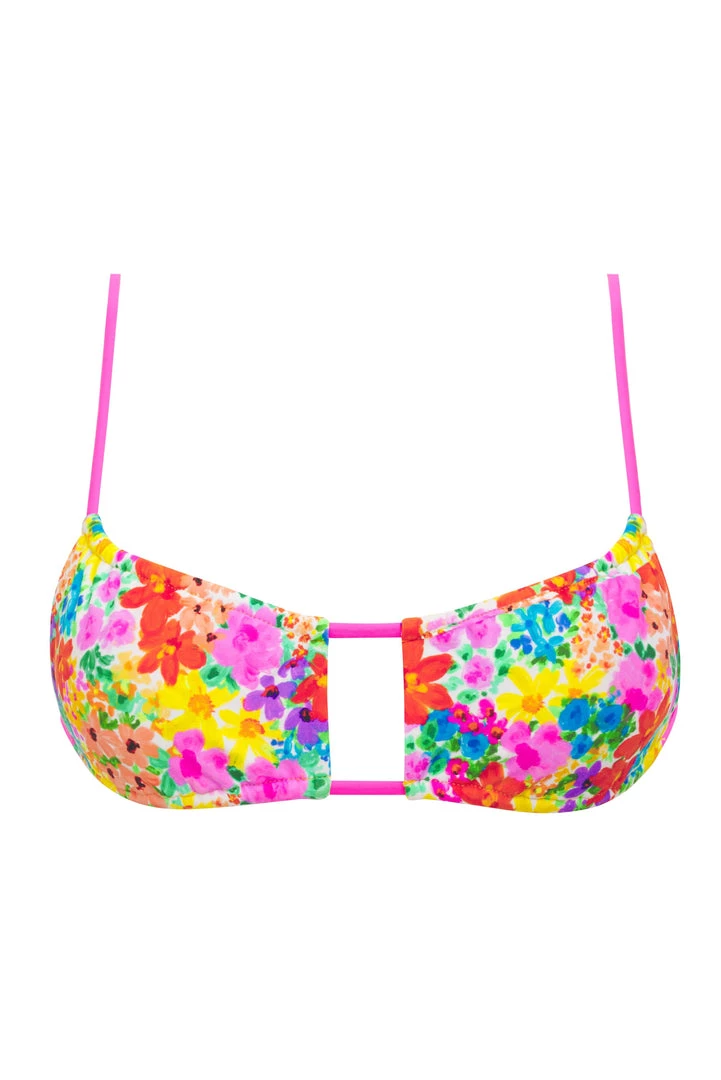 Vibrant bandeau bikini top featuring a neon watercolor floral print and delicate drawstrings at bust. Adjustable shoulder straps, delicate tie at back.