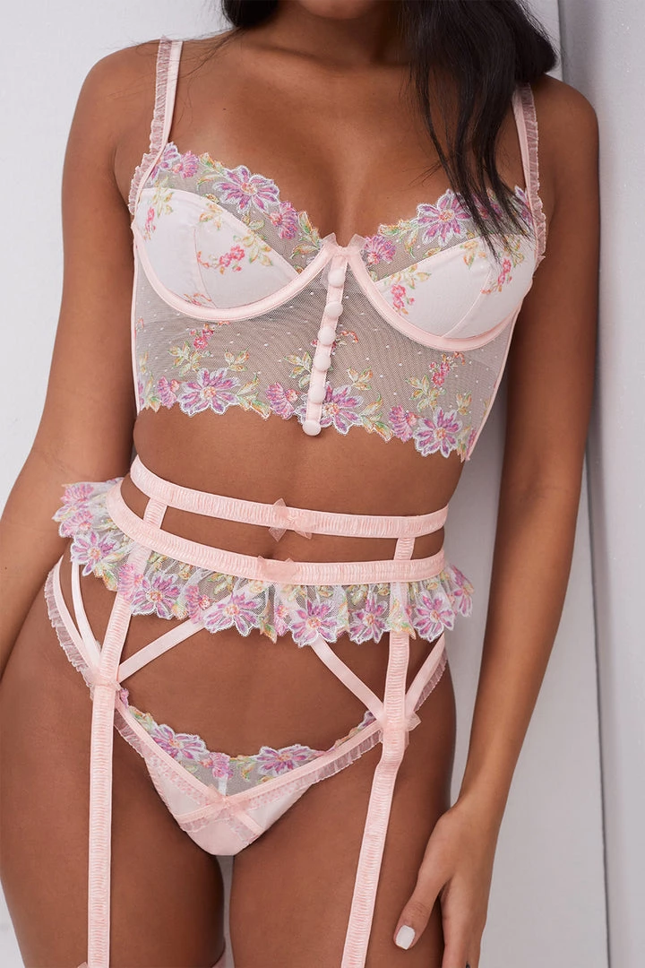 Beautiful shimmer embroidery embellishes this garter’s waving ruffle detail to give your lingerie look a spring-inspired finishing touch.