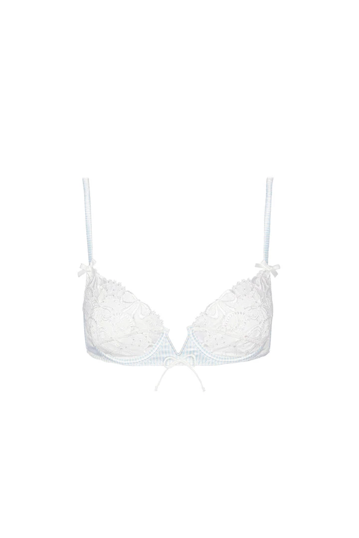 Delicate sheer floral eyelash lace is contrasted with soft satin paneIs and accented with dainty bows. Pair with the matching thong panty for your dreamiest lingerie look yet.