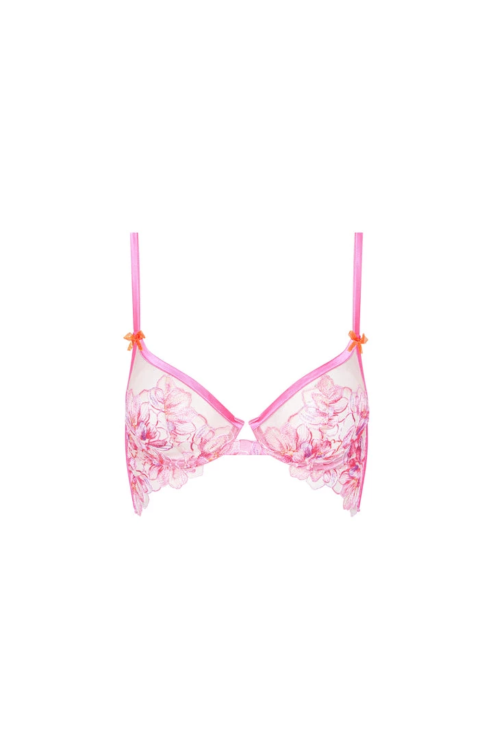 Say aloha to our ravishing Hibiscus blooms underwire bra! Featuring flowering details across an exquisitely embroidered bra with mingling shades of shocking pink and magenta. Completed with notched underwire cups trimmed in satin, organza bows, and a strappy cage back.Â