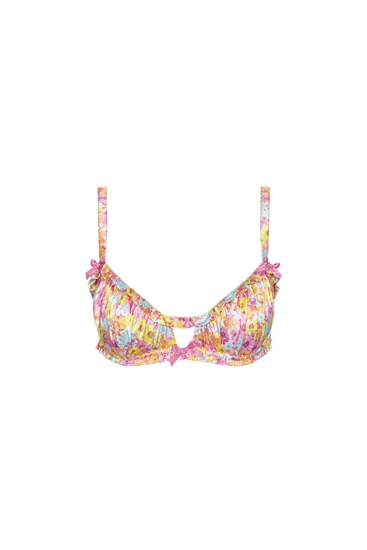 The sweetest thing about this flirty satin bralette? It’s difficult to choose between the shirred ruffles, bow accents, peekaboo cutouts, and cheerful allover floral print. Perfect paired with the matching Punch panty and garter.