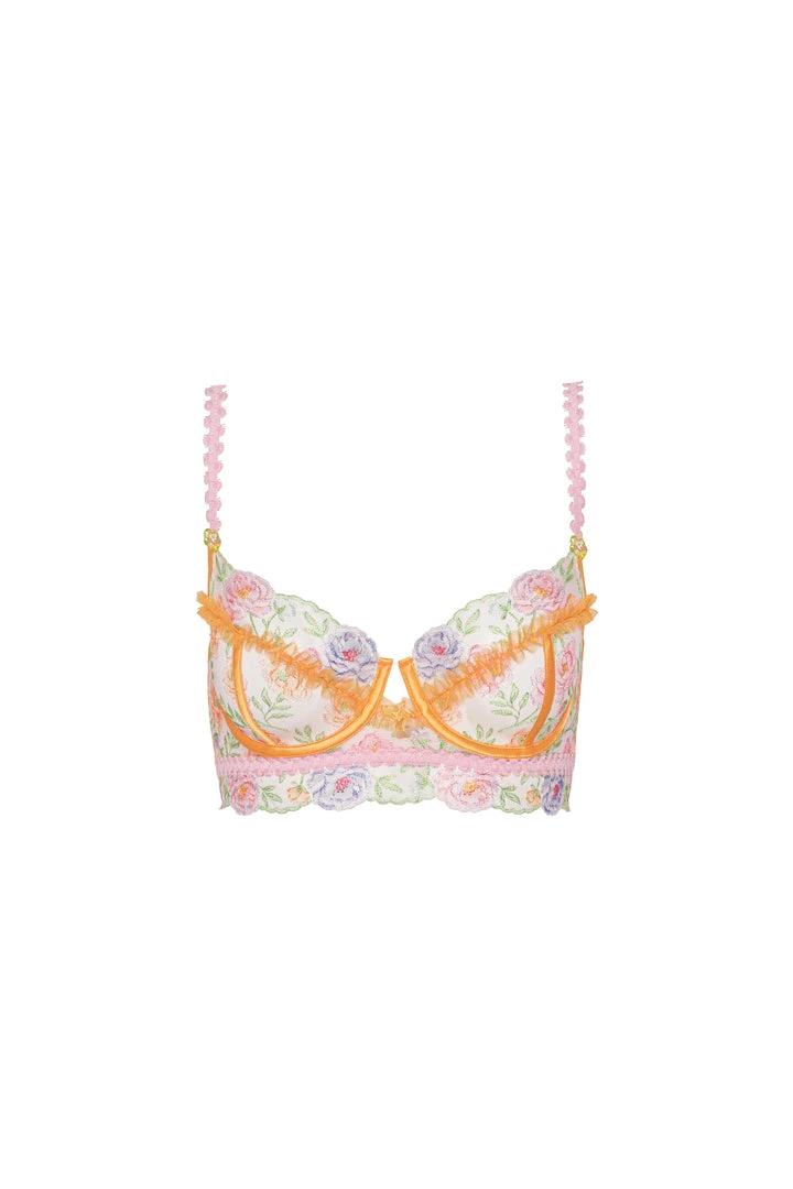 This breathtaking demi style is a fantasia of amped-up pastels, floral embroidery, and craftsy trim. Pair with the matching thong and garter.
