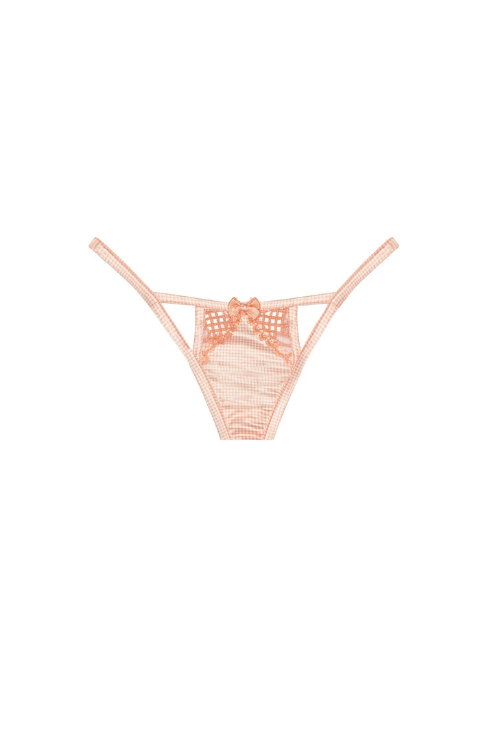 The prettiest piece to add to your top drawer—a stretch satin V-string featuring gingham checks, daisy lace accents, graphic cutouts, and decorative bows in the front and back. Make it a set with the matching Zoe bustier.