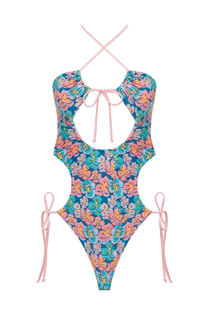 Daring one-piece bathing suit featuring a vintage-inspired painter floral print and bold cutouts. Delicate ties at bust, waist, and back.
